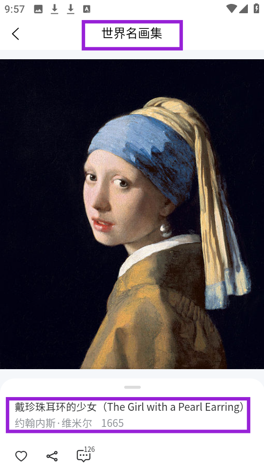 2、世界名畫集頁面,經(jīng)典名作戴珍珠耳環(huán)的少女映入眼簾,維米爾筆觸細(xì)膩,人物神韻盡顯散發(fā)獨(dú)特藝術(shù)魅力。