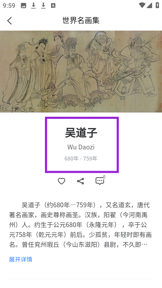 3、繼續(xù)瀏覽世界名畫集,唐代畫圣吳道子作品在列。簡介呈現(xiàn)其生平,讓用戶領(lǐng)略古代大師的非凡藝術(shù)成就。