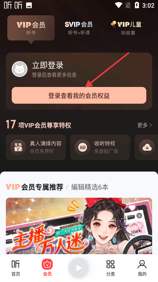 2、會(huì)員頁面展示VIP會(huì)員、SVIP會(huì)員、VIP兒童等會(huì)員類型及對(duì)應(yīng)權(quán)益,頁面提示登錄后查看更多信息,下方列出17項(xiàng)VIP會(huì)員尊享特權(quán)及專屬推薦內(nèi)容。