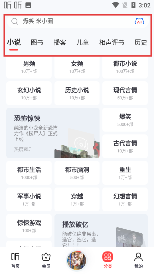 3、分類頁面頂部有搜索欄,下方有小說、圖書、播客等分類標(biāo)簽,再往下是更細(xì)分的小說分類,每個(gè)分類標(biāo)注作品數(shù)量,同時(shí)還有熱門小說推薦板塊。