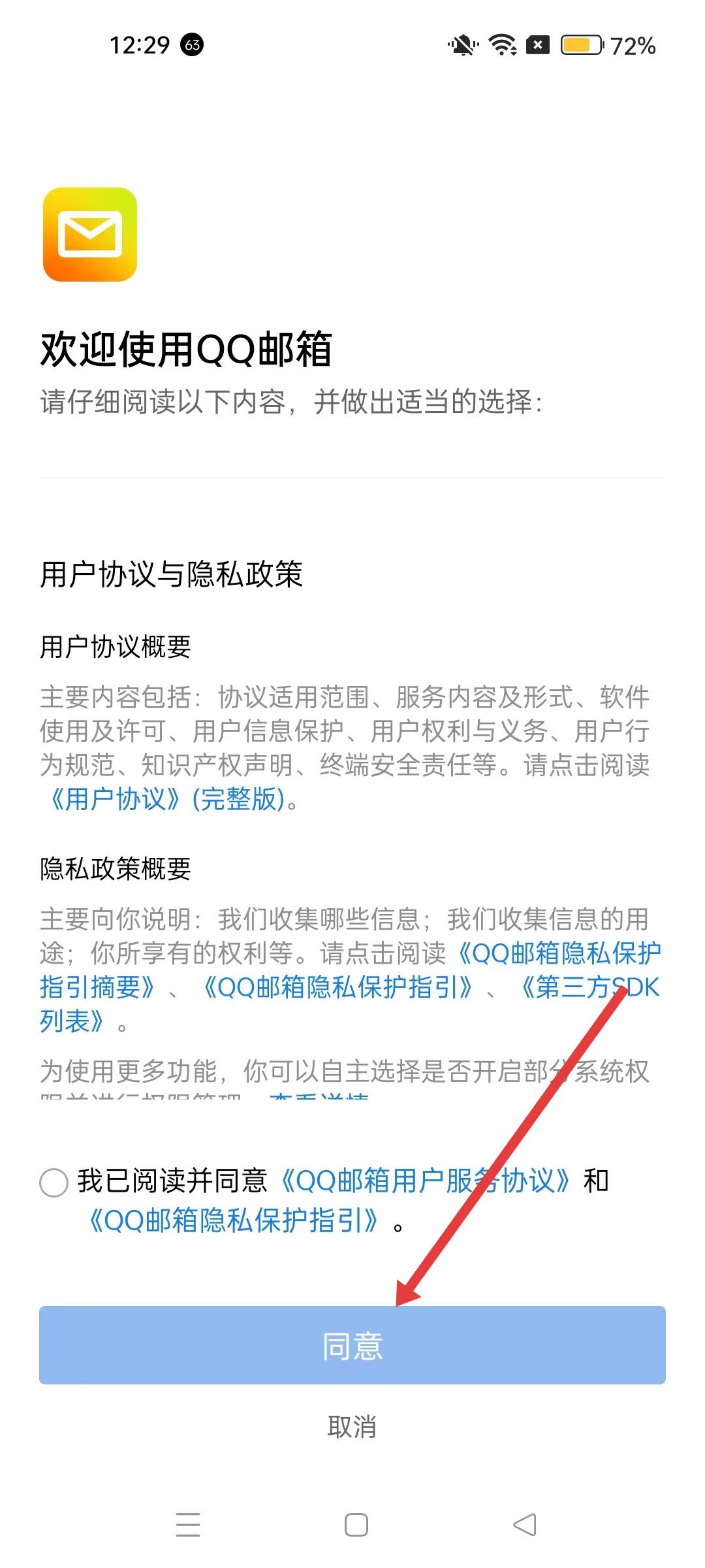 2、選擇QQ郵箱后,閱讀并同意用戶協(xié)議與隱私政策,點(diǎn)擊同意按鈕,進(jìn)入郵箱地址輸入環(huán)節(jié)。