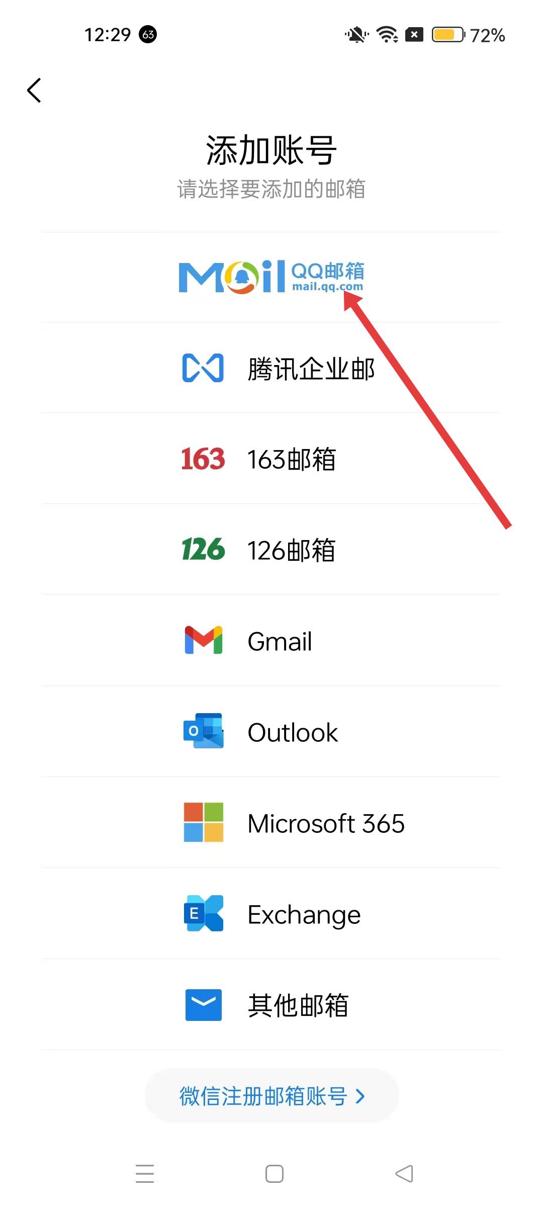1、進(jìn)入添加賬戶界面,可選擇QQ郵箱、騰訊企業(yè)郵、163郵箱等多種郵箱類型,開始添加郵箱賬戶流程。