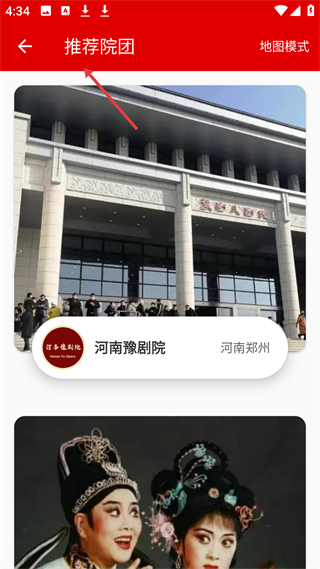 3、推薦院團(tuán)頁面呈現(xiàn)河南豫劇院等豫劇院團(tuán),可查看院團(tuán)信息,還能切換地圖模式查看院團(tuán)位置,助力用戶知曉院團(tuán)情況與具體方位。