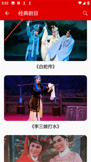 2、經(jīng)典劇目頁面展示了白蛇傳、李三娘打水等經(jīng)典戲曲劇目,能讓用戶瀏覽經(jīng)典戲曲作品相關(guān)內(nèi)容,感受傳統(tǒng)戲曲的藝術(shù)魅力。
