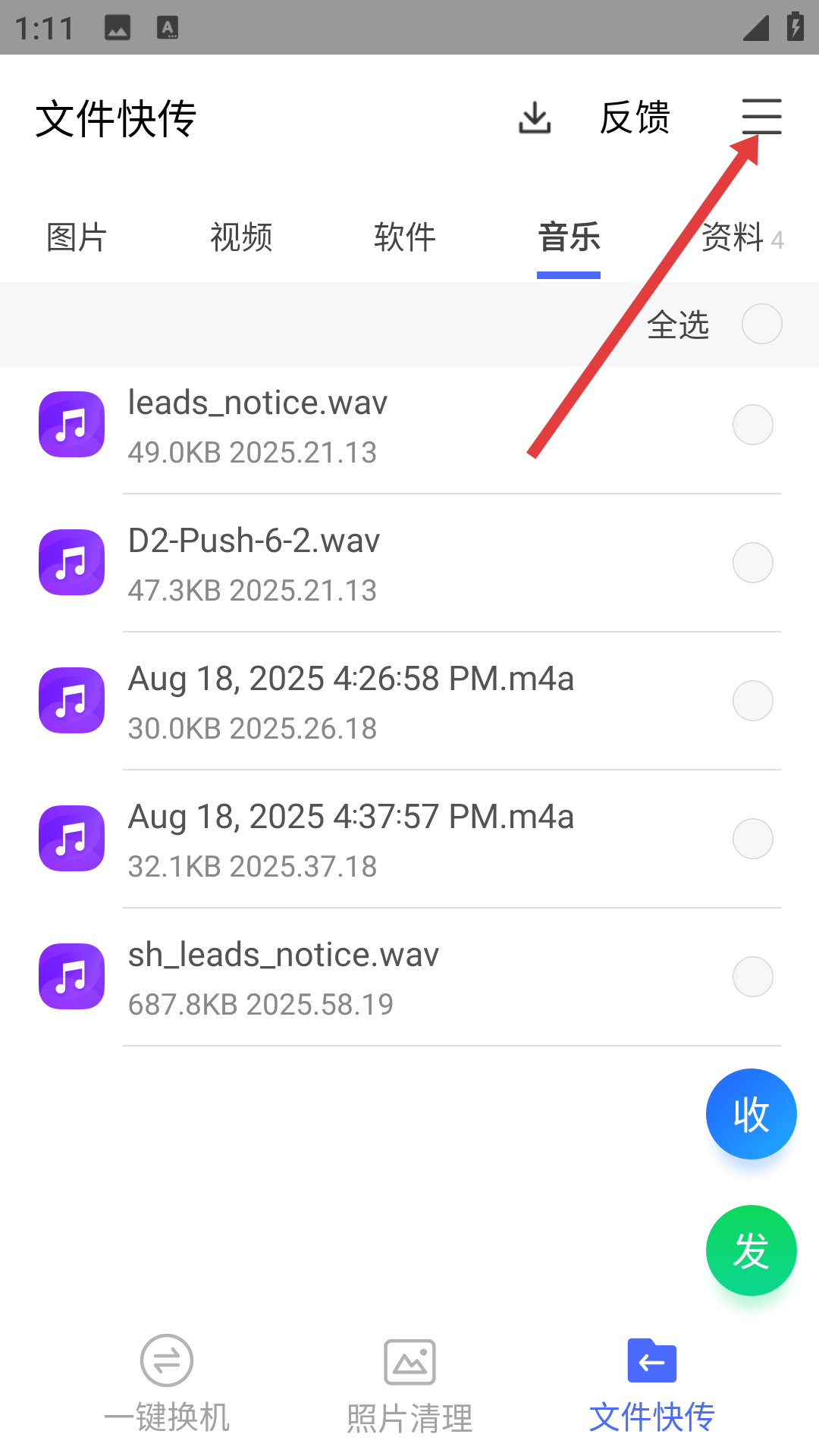 1、打開(kāi)騰訊換機(jī)助手,點(diǎn)擊底部導(dǎo)航欄的文件快傳進(jìn)入文件快傳界面,在該界面點(diǎn)擊右上角的三條橫線(xiàn)圖標(biāo),進(jìn)入更多功能菜單選項(xiàng)。