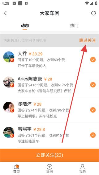1、打開(kāi)車智匯軟件,進(jìn)入大家車問(wèn)的動(dòng)態(tài)頁(yè)面,看到跳過(guò)關(guān)注的提示,點(diǎn)擊跳過(guò)關(guān)注按鈕,進(jìn)入熱門問(wèn)答頁(yè)面。