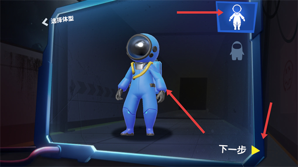 1、開(kāi)始游戲前,可選擇體型,選好后點(diǎn)擊下一步,推進(jìn)角色創(chuàng)建流程,打造屬于自己的太空角色形象。