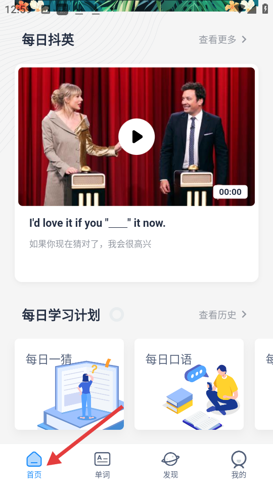 1、點(diǎn)擊首頁設(shè)有每日抖英板塊展示視頻片段并附英文填空練習(xí),下方是每日學(xué)習(xí)計劃,含每日一猜每日口語等項目。