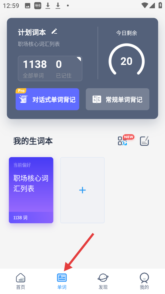 2、點(diǎn)單詞頁面上方計劃詞本顯示職場核心詞匯列表及學(xué)習(xí)進(jìn)度,下方我的生詞本可管理個人生詞,如職場核心詞匯列表有1138詞。