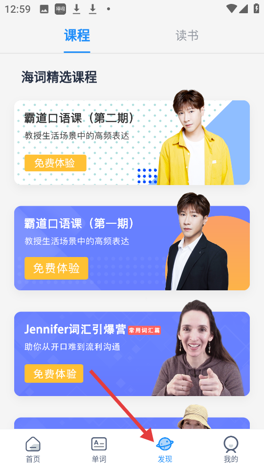 3、點(diǎn)發(fā)現(xiàn)頁面呈現(xiàn)海詞精選課程,像霸道口語課等,提供免費(fèi)體驗助力用戶提升英語口語及詞匯能力。