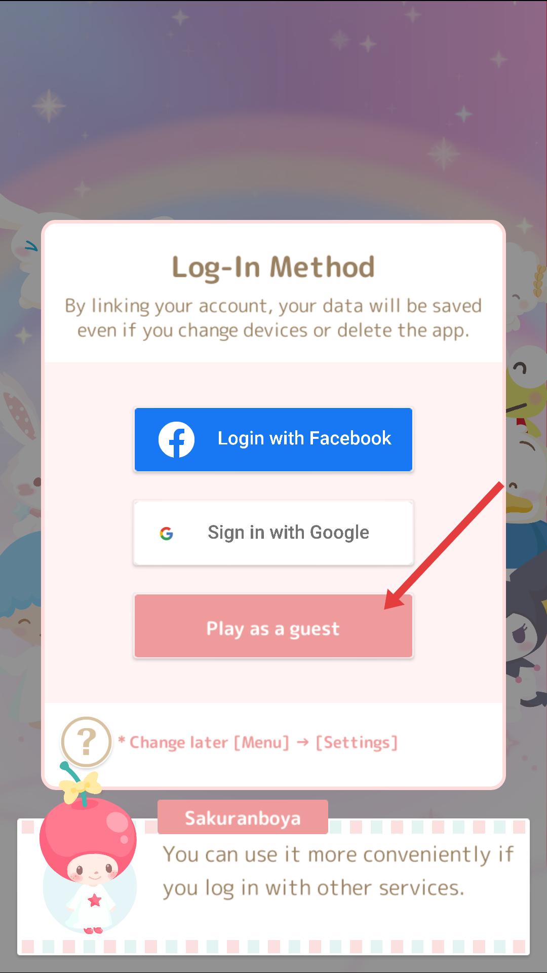 1、點(diǎn)擊Play as a guest,以游客身份進(jìn)入游戲,無(wú)需登錄賬號(hào),直接開(kāi)啟游戲體驗(yàn),后續(xù)可在設(shè)置中更改登錄方式。