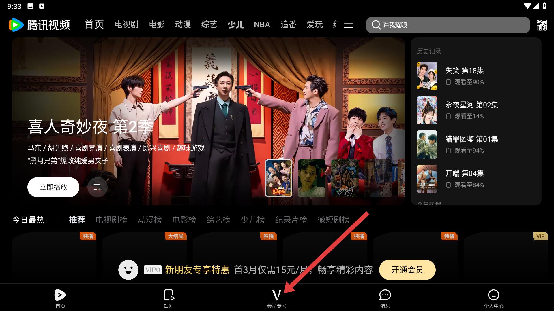 2、會員專區(qū)頁面,找到特惠開通豎屏短劇通的入口,點擊進入開通界面。
