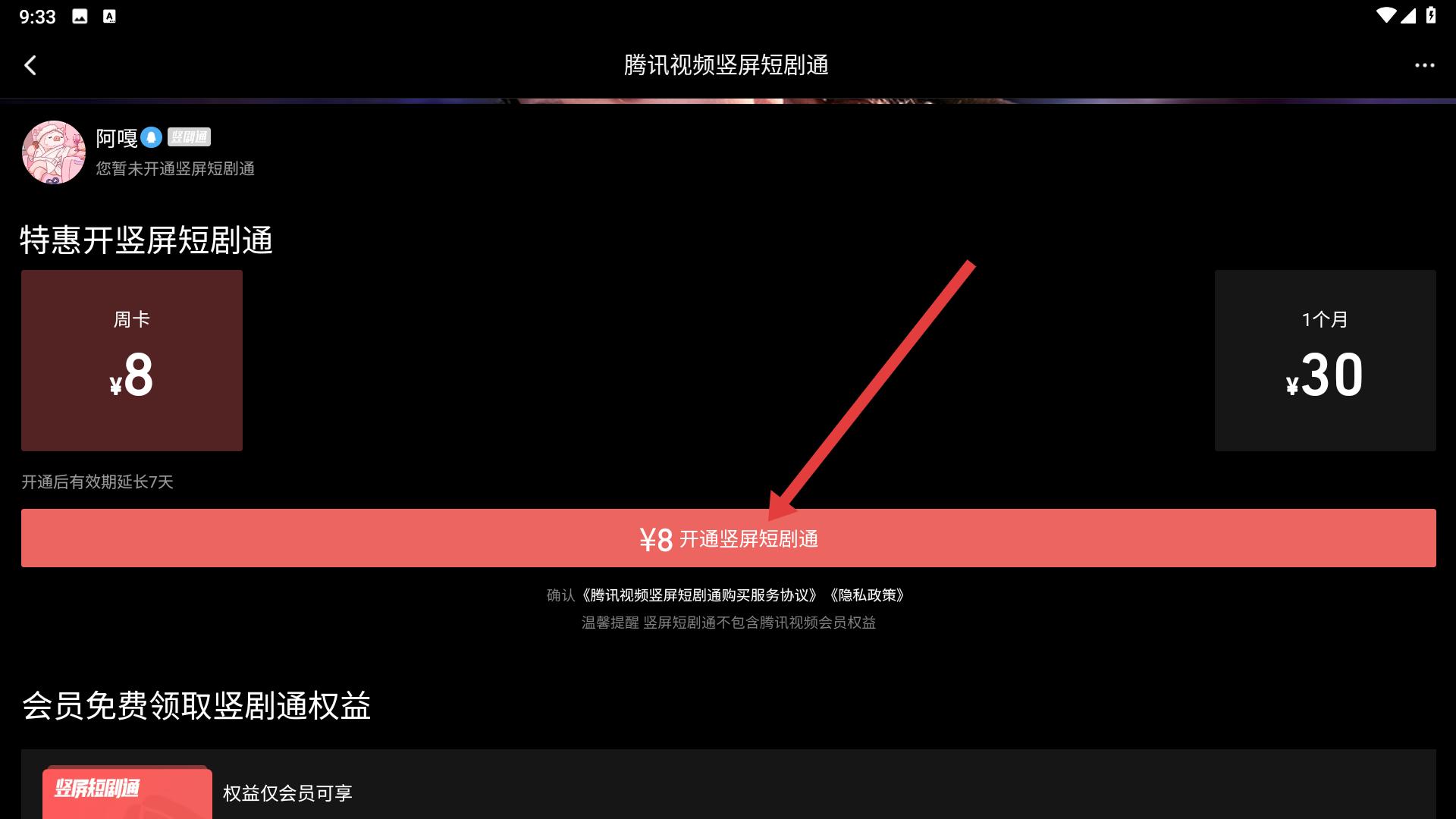3、開通界面,可選擇周卡等套餐,點擊對應開通按鈕,如8元開通豎屏短劇通。
