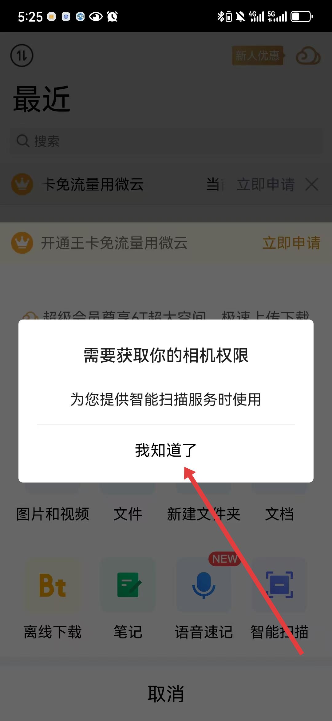 2、點擊智能掃描后會彈出相機權限申請框,提示為提供智能掃描服務需獲取相機權限,點擊我知道了前往系統(tǒng)設置或直接在彈窗中完成授權,確保能調用相機進行掃描。
