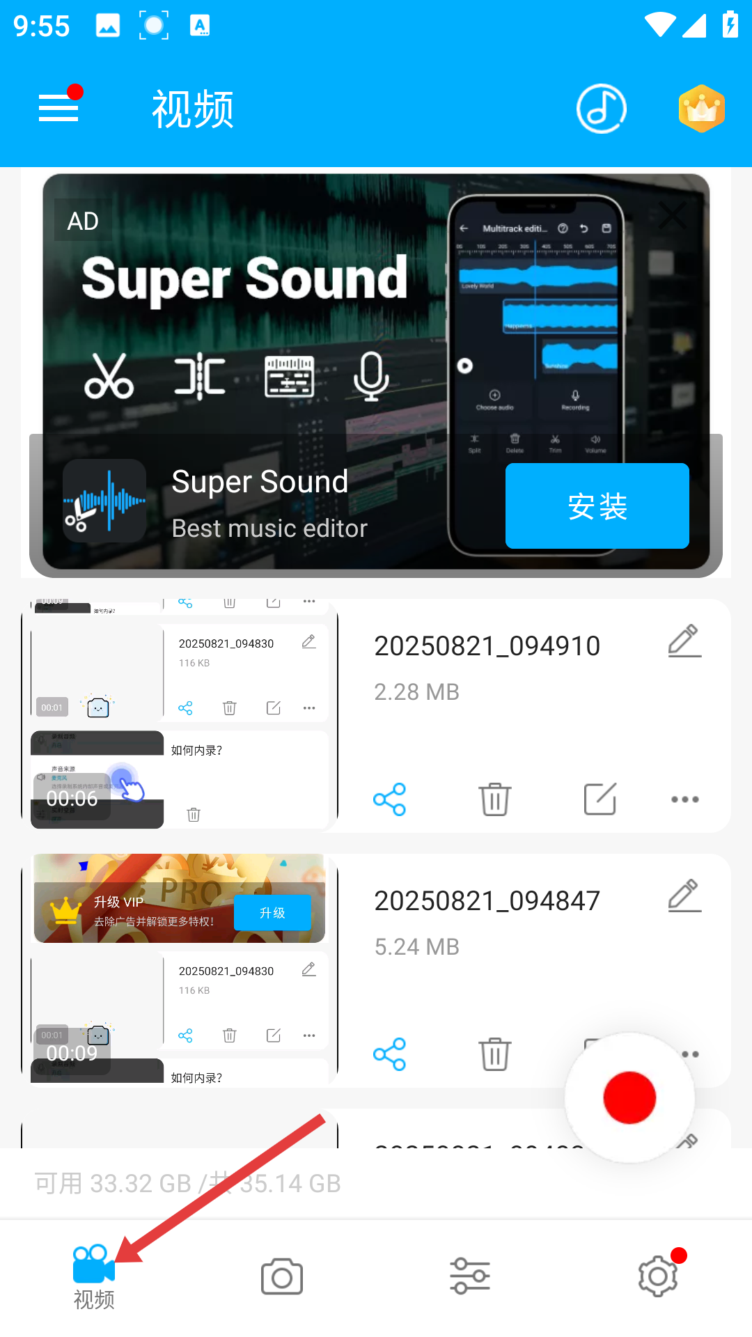 1、打開超級(jí)截圖錄屏大師,點(diǎn)擊底部視頻進(jìn)入視頻管理頁,已錄視頻按時(shí)間排序展示,可查看大小、時(shí)長,還能分享、刪除、編輯,便捷管理錄制內(nèi)容。