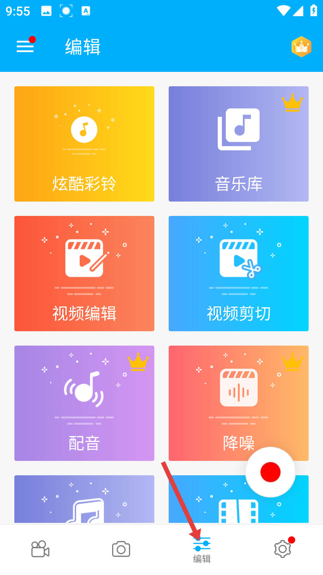 2、用戶若想對(duì)視頻加工,就點(diǎn)底部編輯進(jìn)入編輯頁,有炫酷彩鈴、音樂庫、視頻編輯等功能,能給視頻配樂、剪輯、配音、降噪,豐富錄制的視頻效果。