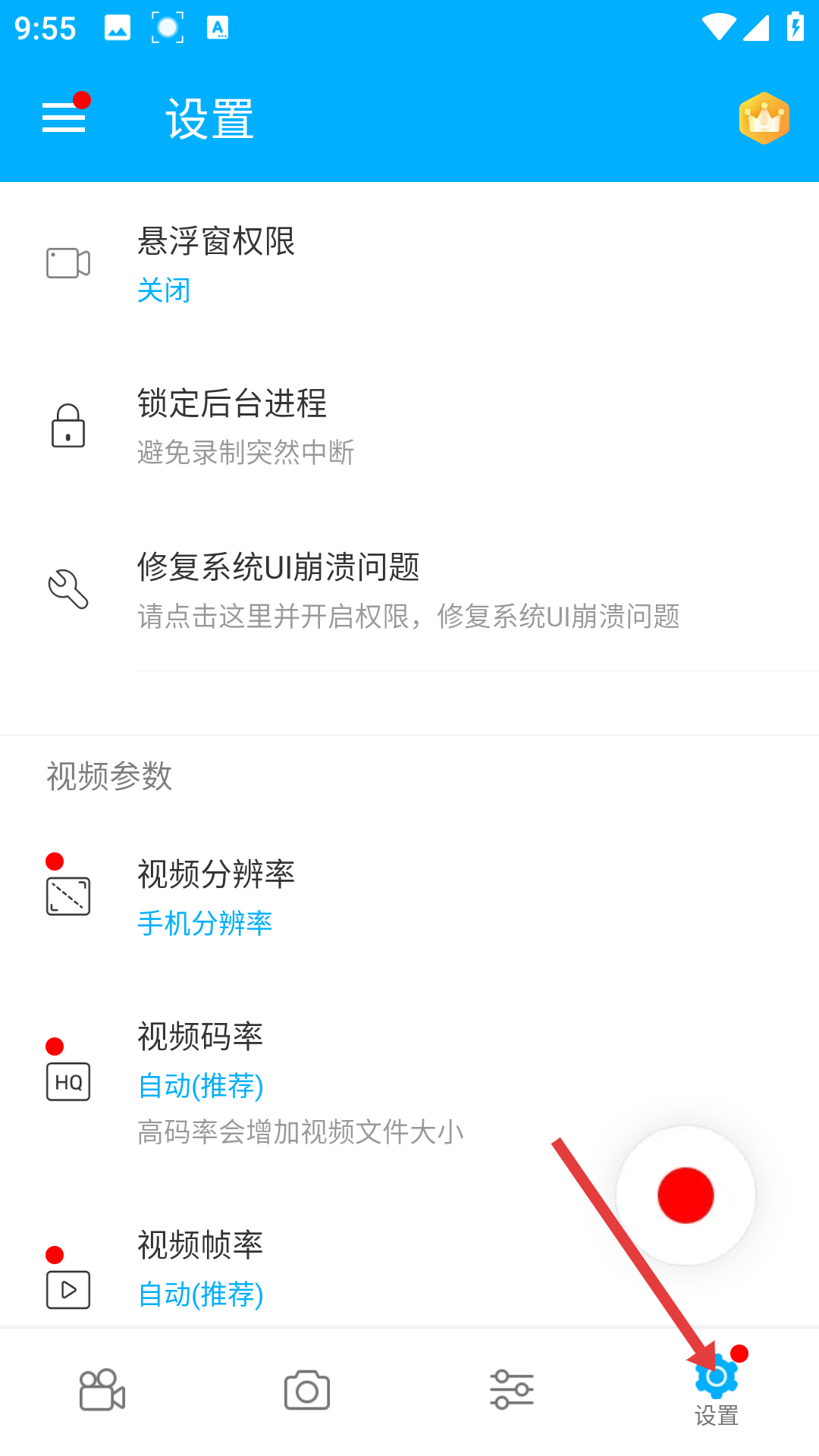 3、若需調(diào)整錄制參數(shù)點(diǎn)底部設(shè)置,在設(shè)置頁可管理懸浮窗權(quán)限、鎖定后臺(tái)防中斷,還能設(shè)置視頻分辨率、碼率、幀率,按需優(yōu)化錄制質(zhì)量。