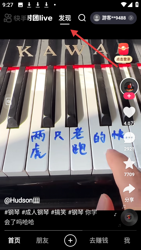 2、圖片為快手極速版發(fā)現(xiàn)界面,展示一條鋼琴彈奏短視頻,畫面右上角有游客賬號信息和登錄提示,可進行互動操作。