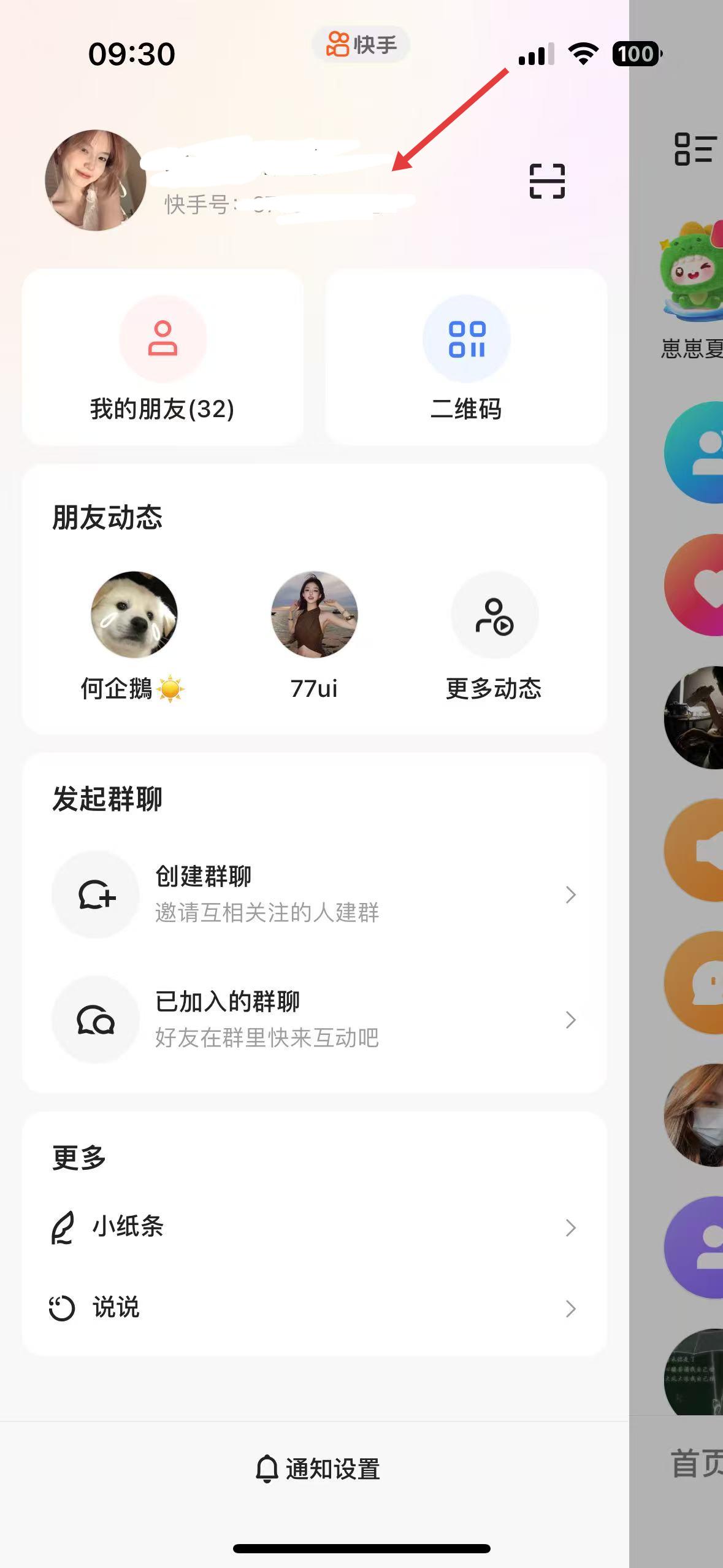 4、個人主頁側(cè)邊欄,展示用戶頭像、快手號,有我的朋友、二維碼等功能區(qū),可查看朋友動態(tài)、發(fā)起群聊。