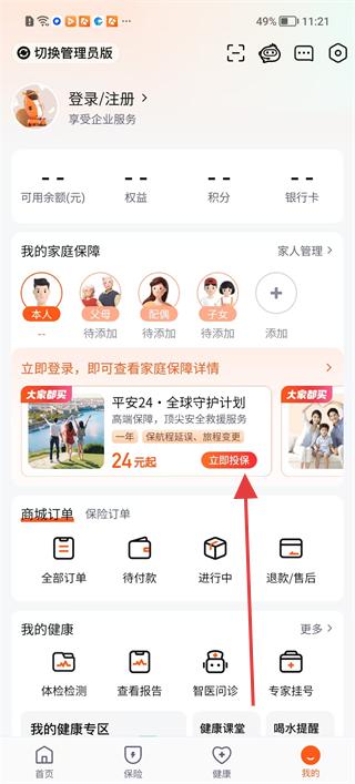 4、進(jìn)入我的頁面查看家庭保障、訂單等信息,選擇平安24全球守護(hù)計劃等保險產(chǎn)品,點擊立即投保,完成保險選購操作。