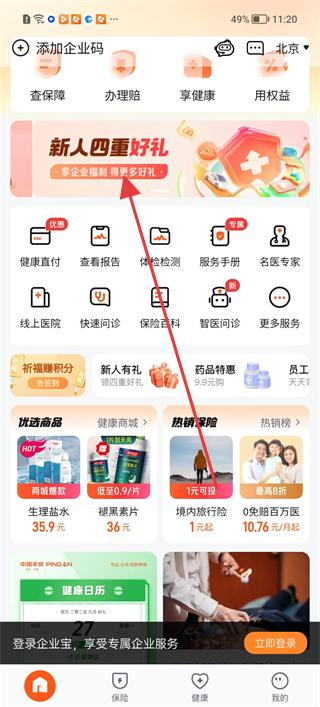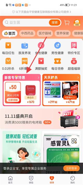 3、進(jìn)入健康商城頁面瀏覽中西藥品、醫(yī)療器械等健康產(chǎn)品分類,查看新客專享特惠和天天秒殺的產(chǎn)品,選擇心儀產(chǎn)品。
