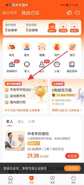 2、進(jìn)入保險頁面瀏覽車險、意外、健康等保險分類,選擇平安學(xué)平險等熱門保險產(chǎn)品,查看詳情。
