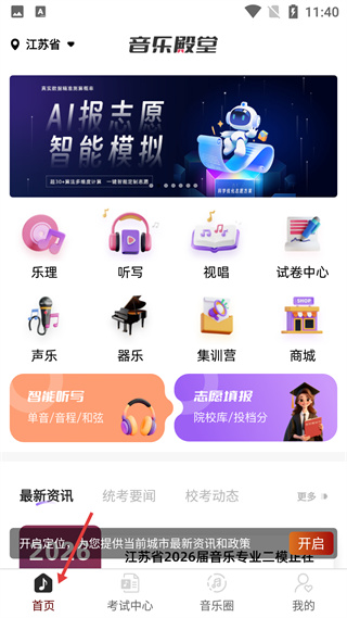 1、首頁定位江蘇省,有樂理、聽寫等功能入口,還有智能聽寫、志愿填報板塊,可查看最新資訊,底部是首頁入口。