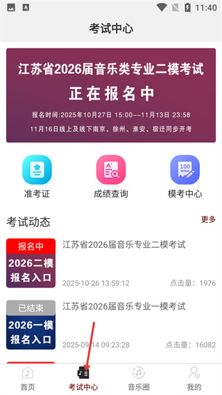 2、試中心頁展示江蘇省2026屆音樂類專業(yè)二模考試報名信息,有準(zhǔn)考證、成績查詢等功能,可查看考試動態(tài),底部是考試中心入口。