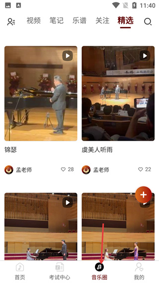 3、音樂圈頁有視頻、筆記等分類,展示孟老師的錦瑟、虞美人聽雨等音樂視頻,底部是音樂圈入口。