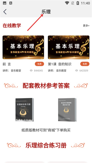4、樂理頁有在線教學(xué)的基本樂理課程,還有配套教材參考答案、樂理綜合練習(xí)冊,紙質(zhì)版教材可在商城購買。