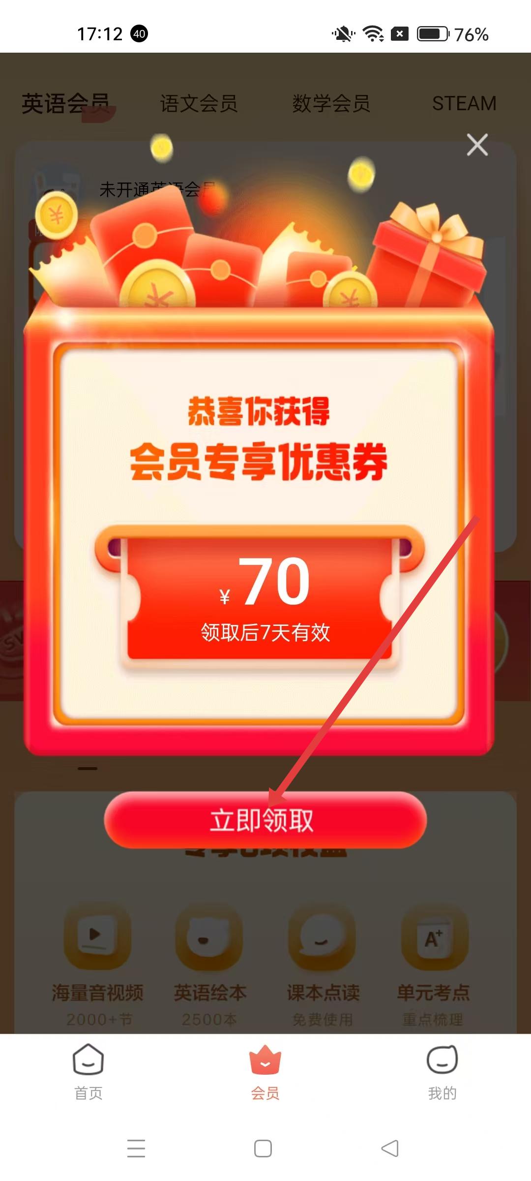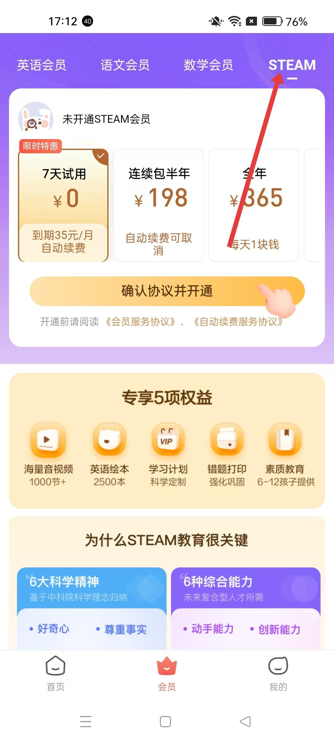 4、切換到STEAM會(huì)員分類,同樣有7天試用、連續(xù)包半年、全年等付費(fèi)選項(xiàng),開通后可享受專享5項(xiàng)權(quán)益,包括海量音視頻、英語繪本、學(xué)習(xí)計(jì)劃等。