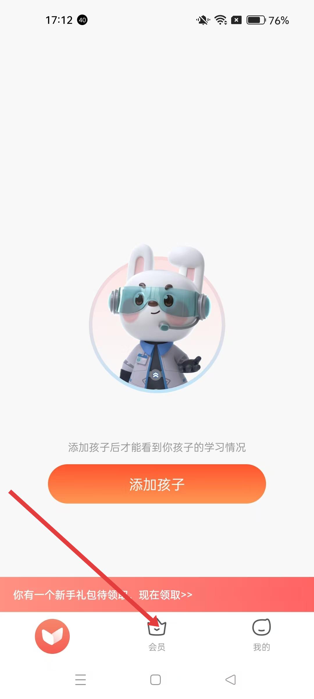 1、進(jìn)入一起學(xué)APP界面,底部有會(huì)員功能入口,點(diǎn)擊可進(jìn)入會(huì)員相關(guān)界面,同時(shí)有添加孩子入口,添加后可查看孩子學(xué)習(xí)情況,還有新手禮包待領(lǐng)取提示。