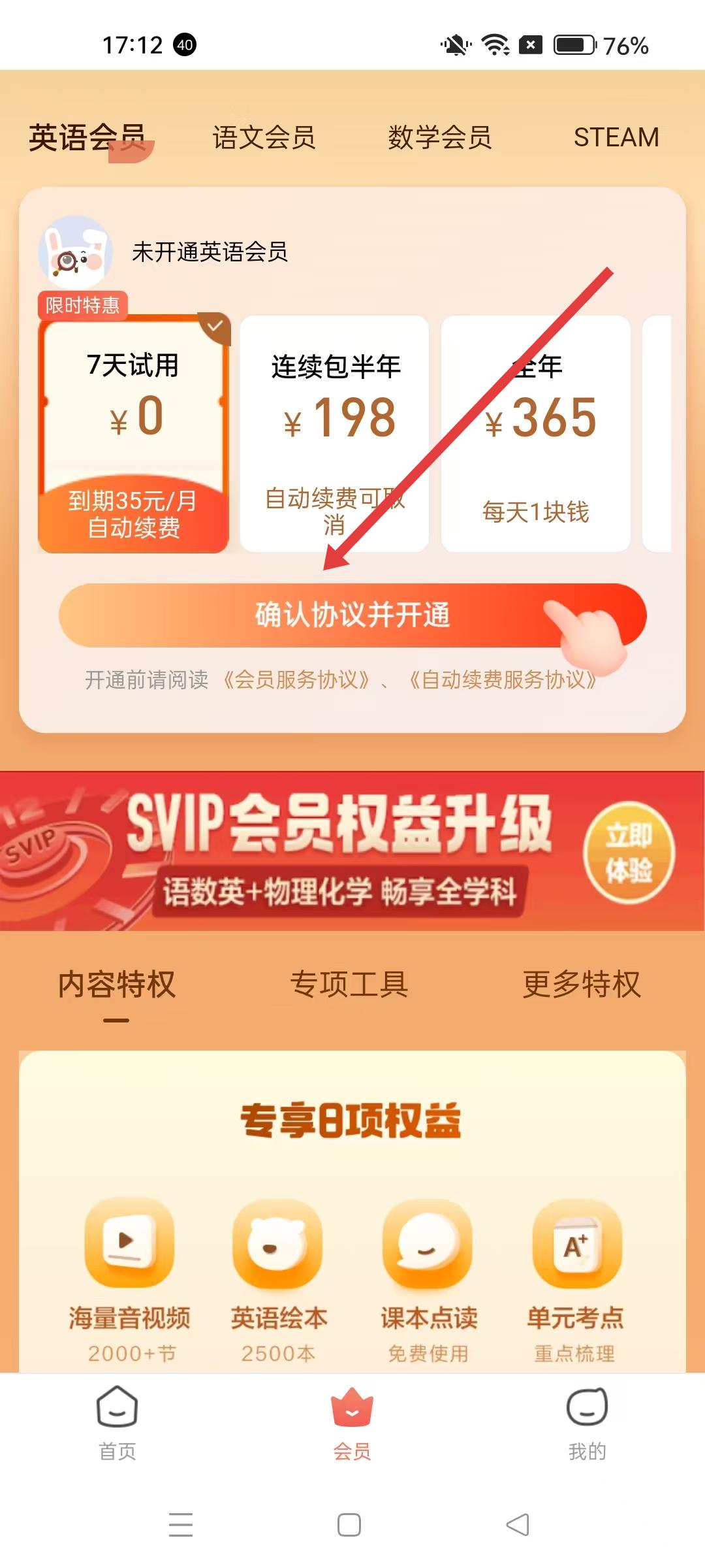 3、進(jìn)入會(huì)員界面,有英語會(huì)員、語文會(huì)員、數(shù)學(xué)會(huì)員、STEAM等不同學(xué)科會(huì)員分類,以英語會(huì)員為例,有7天試用、連續(xù)包半年、全年等不同付費(fèi)選項(xiàng),可確認(rèn)協(xié)議并開通。