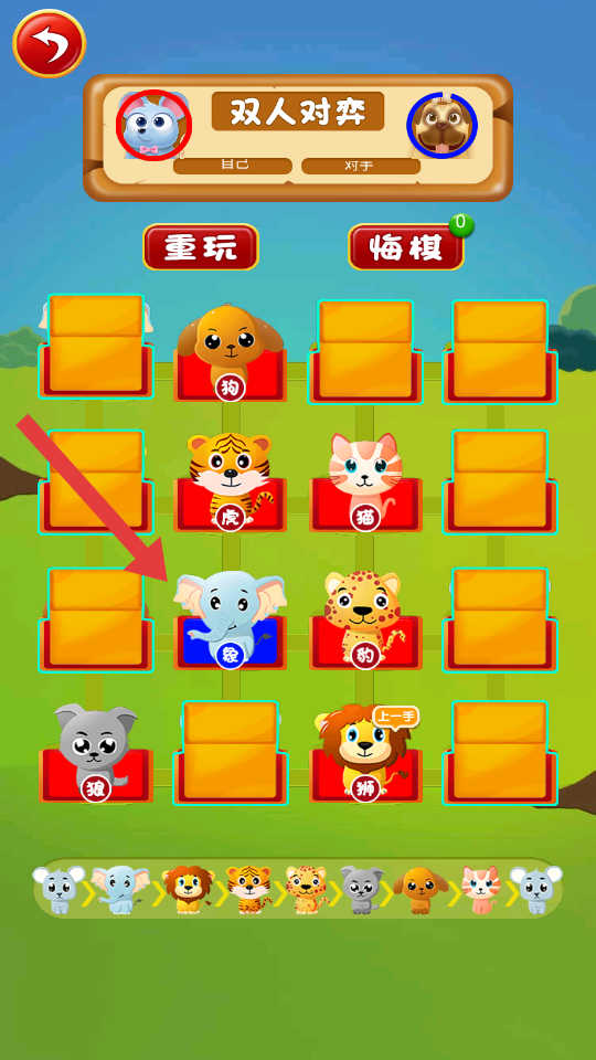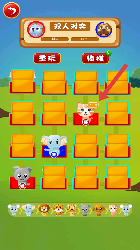 2、進(jìn)入雙人對弈后,棋盤上有多個(gè)空位,雙方輪流放置代表不同動(dòng)物的棋子,像貓、象、狼等,布局自己的陣容。