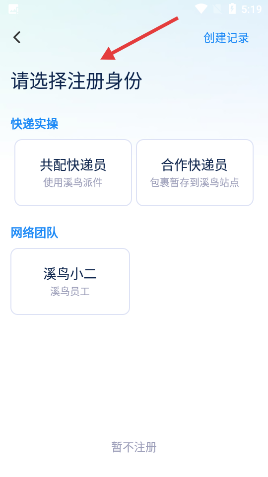 1、注冊身份選擇頁面,分快遞實操共配、合作快遞員和網(wǎng)絡團隊溪鳥小二類別,可進行身份選擇。