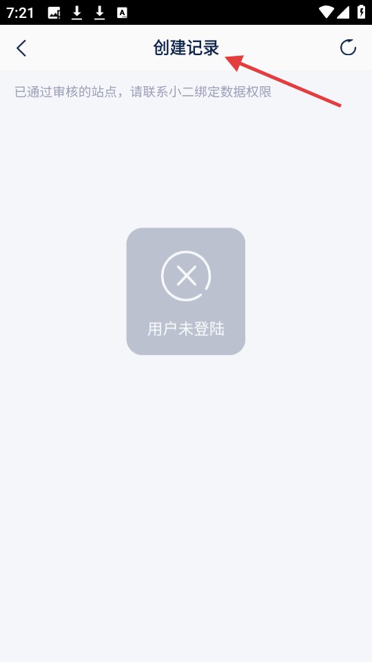 2、創(chuàng)建記錄頁面,提示已審核站點聯(lián)系小二綁定數(shù)據(jù)權(quán)限,因用戶未登錄當前無法操作。
