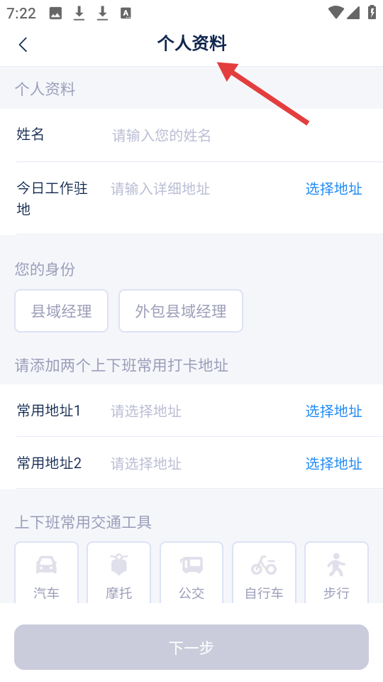 3、個人資料頁面,可填寫姓名、工作駐地等信息,還能選擇身份、添加常用打卡地址及交通方式。