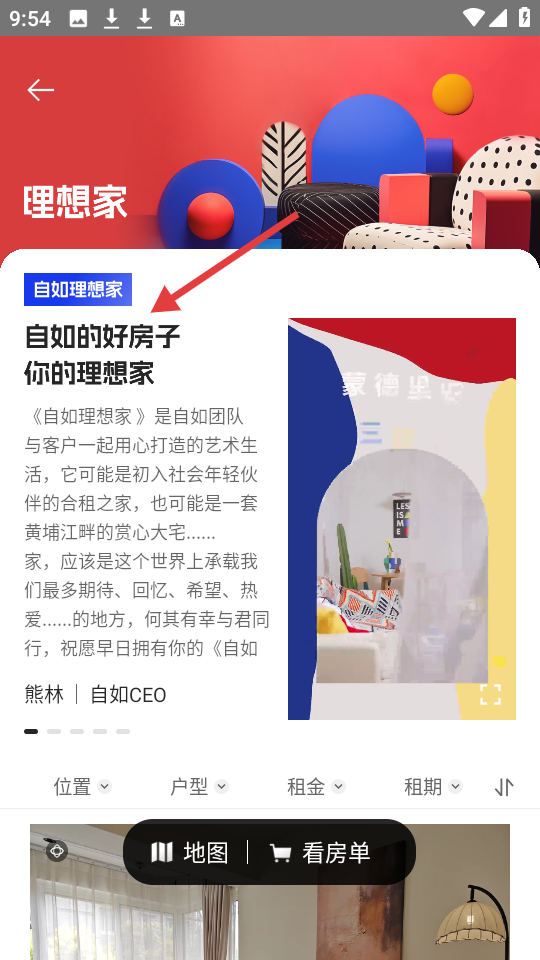 2、理想家頁(yè)面詮釋其為團(tuán)隊(duì)與客戶共創(chuàng)的藝術(shù)生活,展現(xiàn)理念與愿景,下方設(shè)位置、戶型等篩選功能助選好房。
