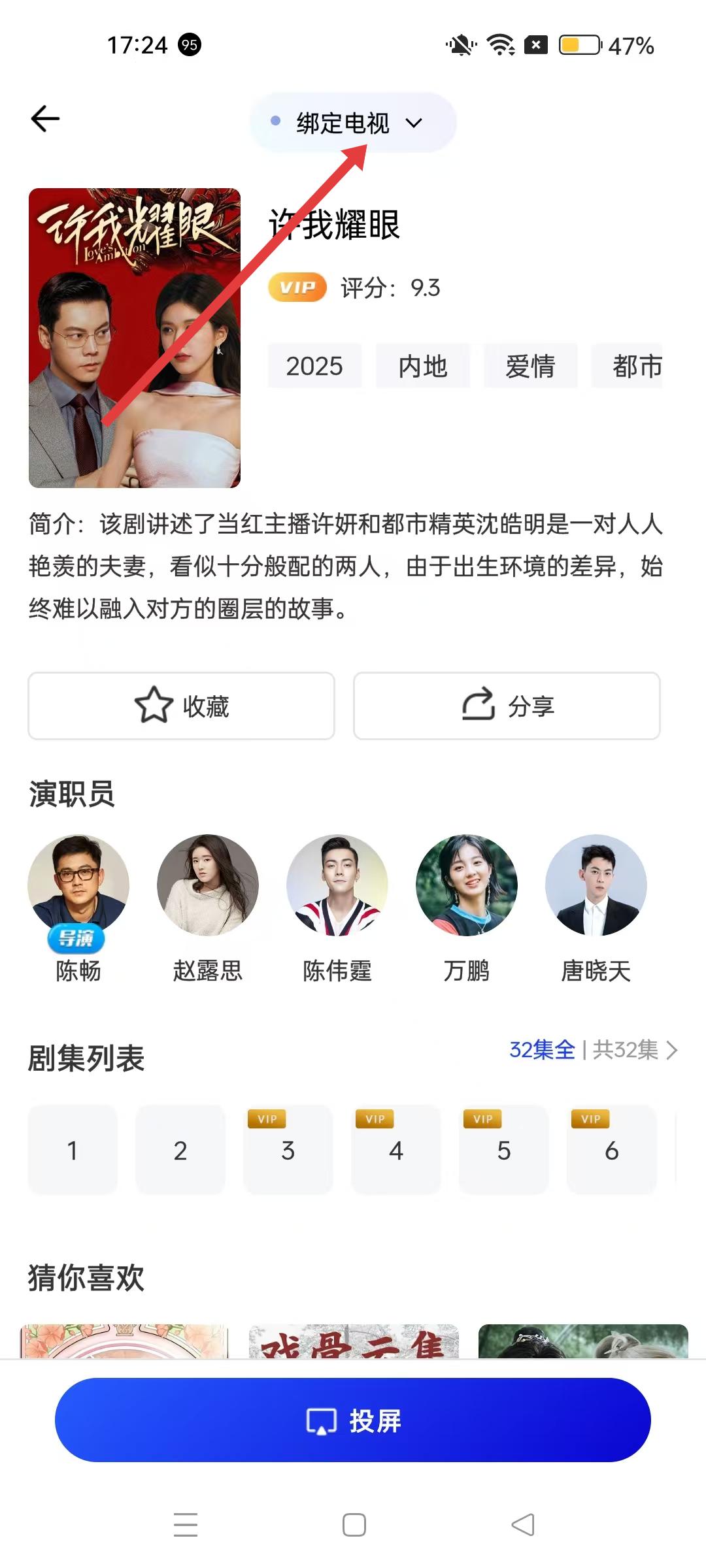 3、影視詳情頁,點(diǎn)擊綁定電視,可進(jìn)入管理電視界面,進(jìn)行電視綁定操作,實(shí)現(xiàn)投屏等功能。
