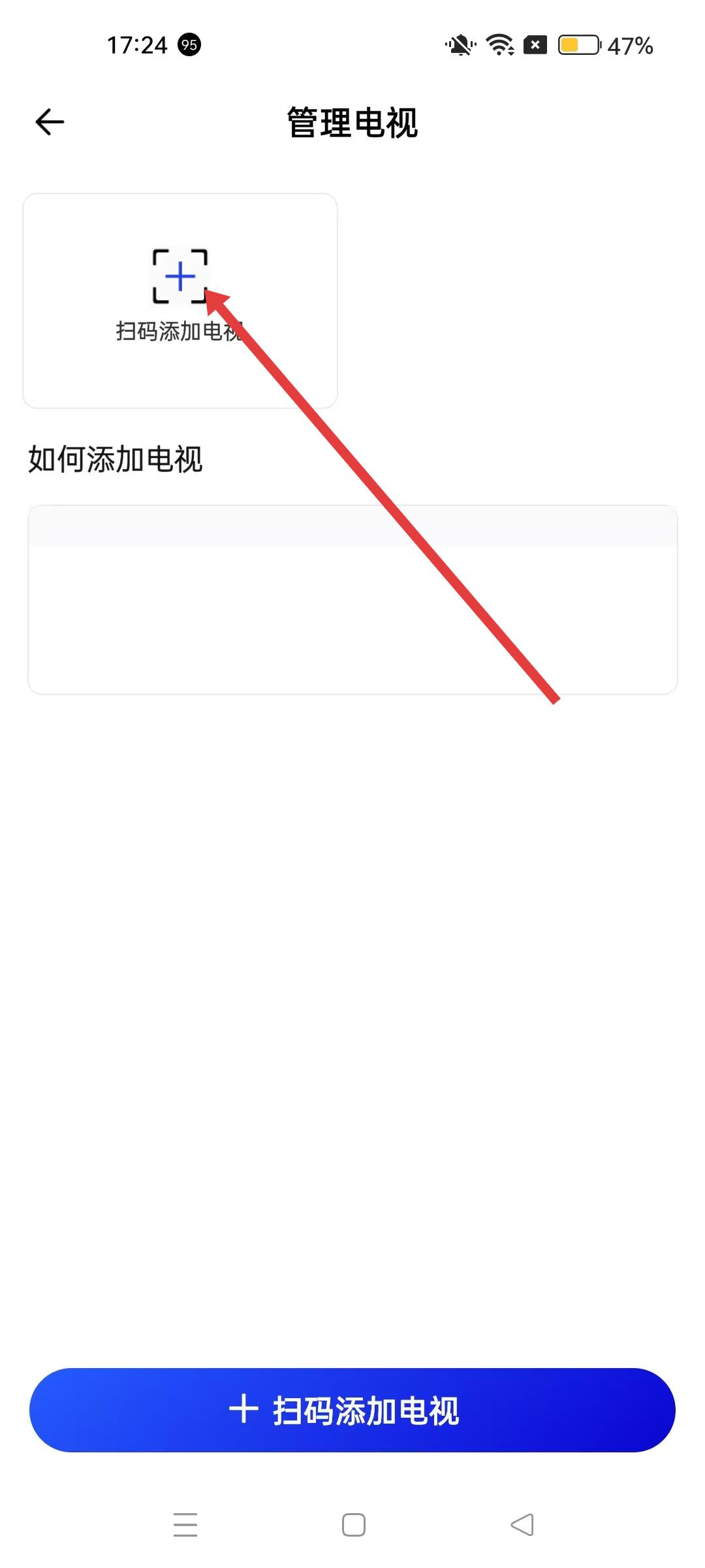 4、管理電視界面,點(diǎn)擊掃碼添加電視,通過掃描電視對應(yīng)的二維碼,完成電視綁定,以便后續(xù)使用投屏等服務(wù)。