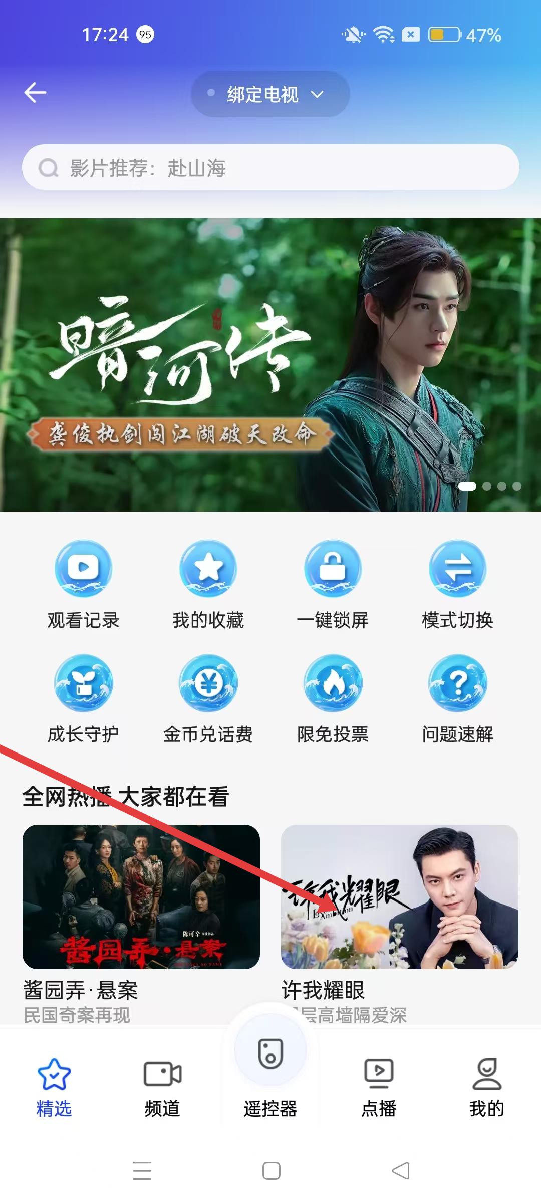 2、看電視界面,可查看觀看記錄、我的收藏等功能,還能參與金幣兌話費(fèi)等活動,豐富影視使用體驗(yàn)。