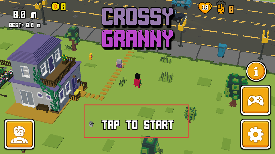 1、點(diǎn)擊TAP TO START開(kāi)始游戲,操控角色在道路上移動(dòng),幫助奶奶躲避來(lái)往車(chē)輛,同時(shí)可收集金幣,積累分?jǐn)?shù)和移動(dòng)距離。
