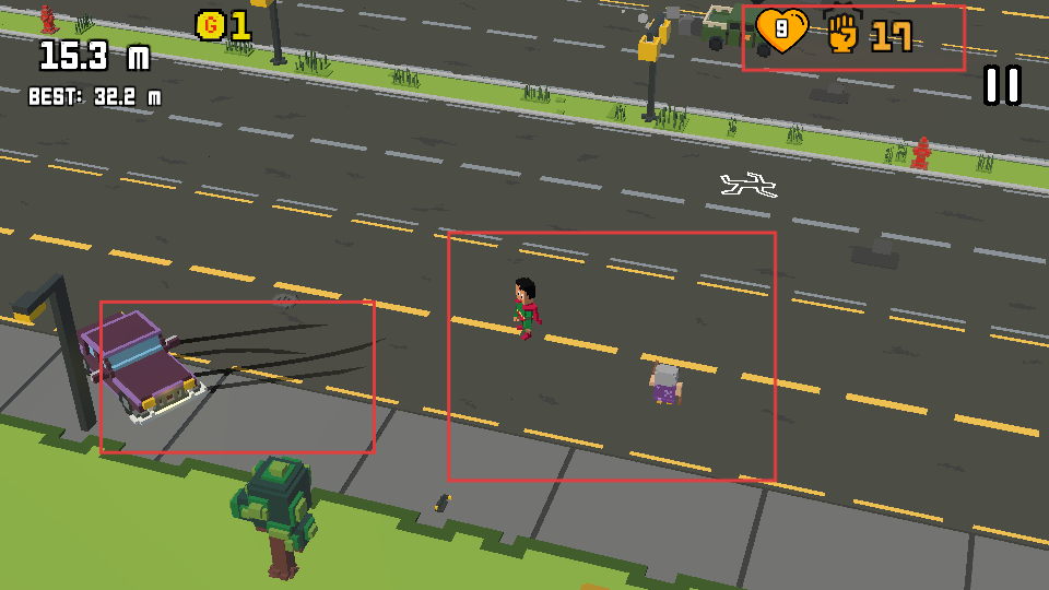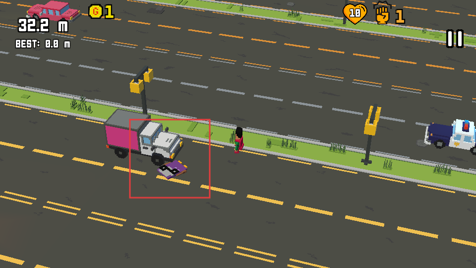 3、游戲中要關(guān)注生命值和力量值,合理規(guī)劃移動(dòng)路線,在車(chē)輛間隙穿行,盡可能走得更遠(yuǎn),提升移動(dòng)距離和得分。