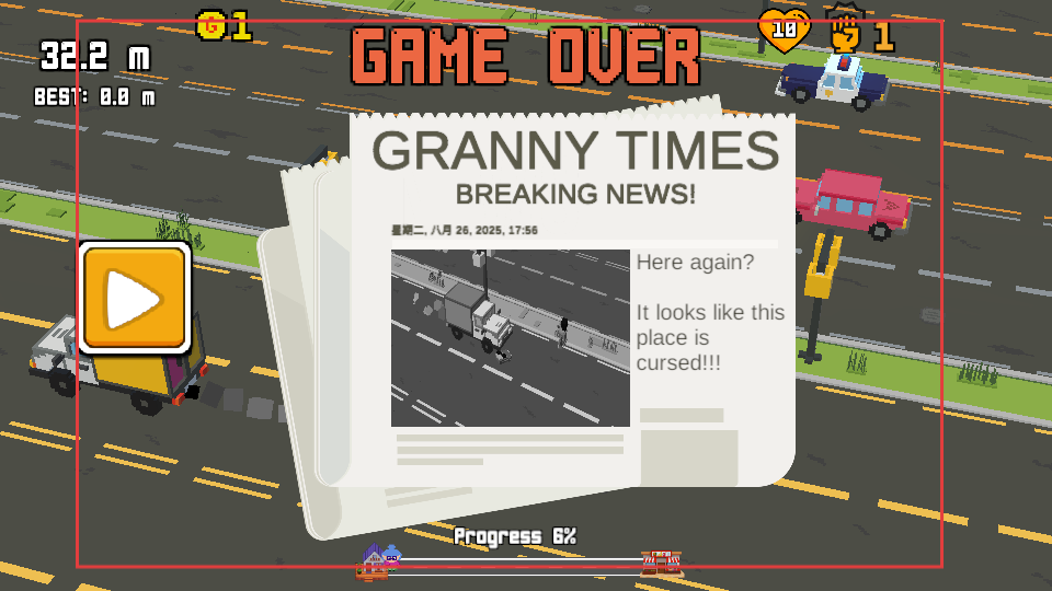 4、若奶奶被車(chē)輛撞到,游戲結(jié)束,會(huì)顯示GAME OVER,可點(diǎn)擊重新開(kāi)始按鈕,再次挑戰(zhàn),爭(zhēng)取更好的游戲成績(jī)。