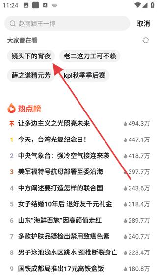 1、打開微視app進入搜索頁面,可看到大家都在看的熱點如鏡頭下的宵夜等,點擊鏡頭下的宵夜,進入相關(guān)內(nèi)容頁面。