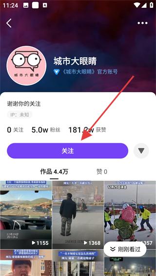 4、若對創(chuàng)作者城市大眼睛的內(nèi)容感興趣,進入其主頁,可查看粉絲數(shù)、獲贊數(shù)等信息,點擊關(guān)注按鈕,關(guān)注該創(chuàng)作者。