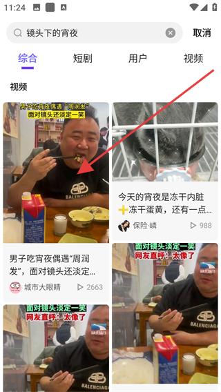 2、在內(nèi)容頁面可瀏覽各類相關(guān)視頻,如男子吃宵夜偶遇周潤發(fā)的視頻,點擊進入視頻播放頁面。