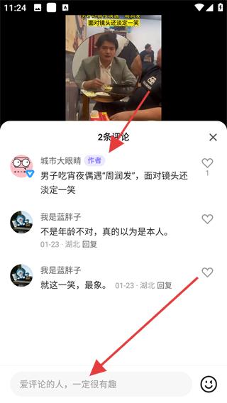 3、在視頻播放頁面可查看其他用戶的評論,如對視頻中人物的調(diào)侃,點擊輸入框,準備發(fā)表自己的評論。