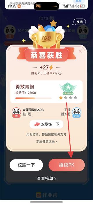 4、答題完成后若恭喜獲勝,可點擊繼續(xù)PK,繼續(xù)參與口算PK賽,也可選擇炫耀一下或查看榜單等操作。