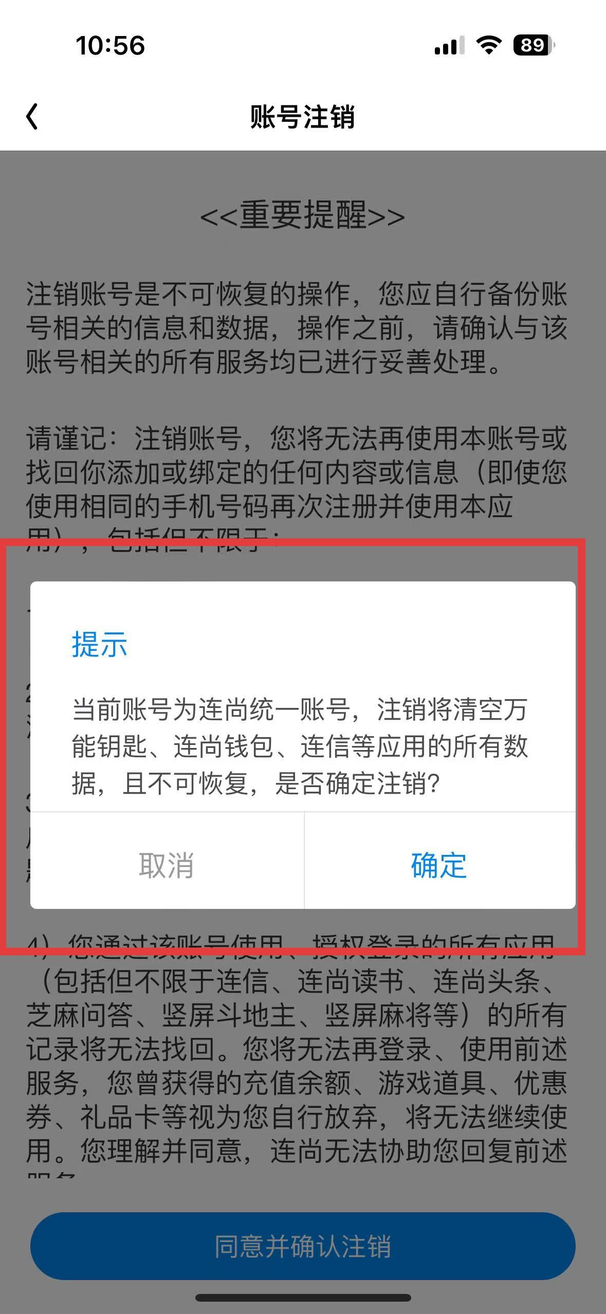 4、賬號(hào)注銷(xiāo)頁(yè)面彈出提示,當(dāng)前賬號(hào)為連尚統(tǒng)一賬號(hào),注銷(xiāo)會(huì)清空萬(wàn)能鑰匙、連尚錢(qián)包等應(yīng)用數(shù)據(jù)且不可恢復(fù),詢問(wèn)是否確定注銷(xiāo),可選擇取消或確定。